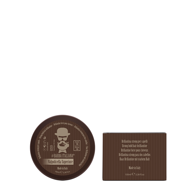 Brillantina strong dall’effetto luminoso e a estrema definizione e tenuta per uno stile old-school.