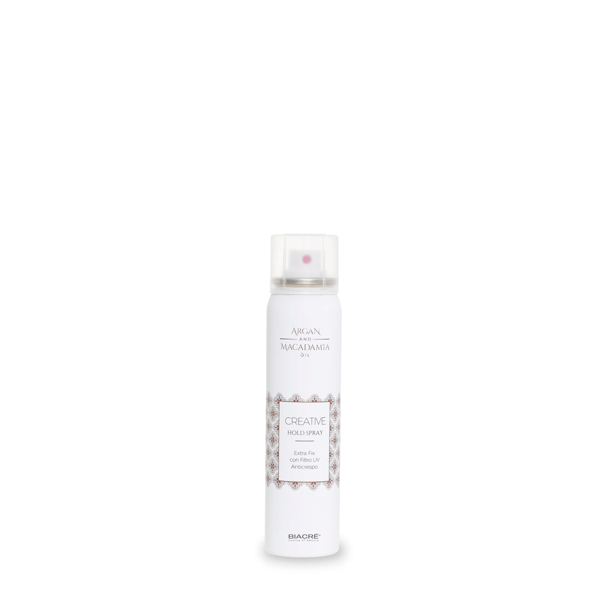 Spray flessibile ma con tenuta extra. Ideale per tutti gli styling, addizionato con Olio di Argan e Macadamia.