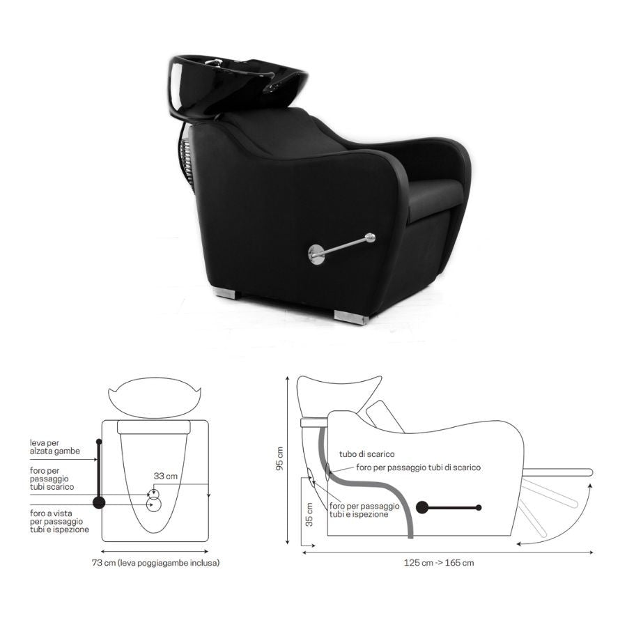 Il lavatesta Virginia rappresenta l'eccellenza nel settore parrucchieri, combinando eleganza e praticità. Questo modello nero si distingue per lo schienale reclinabile che assicura comfort totale. La pregiata vasca in ceramica, protetta da un bordo in silicone, garantisce durabilità ed eleganza. Ogni dettaglio ergonomico è stato studiato con cura: dalla leva per l'alzata gambe all'inclinazione ottimale della vasca. Adattabile nelle dimensioni, Virginia trasformerà il momento del lavaggio in un'esperienza di puro relax per i vostri clienti.