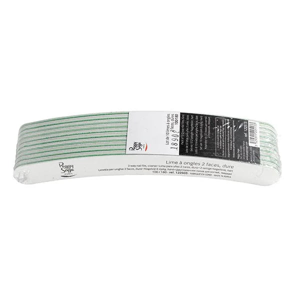 Il lotto di 10 limette mezzaluna 2 facce PEGGY SAGE è perfetto per una manicure professionale. Le limette, con una superficie ampia e una grana di 100/180, offrono un maggiore comfort e una migliore ergonomia. Scegli la giusta grana in base alla durezza delle unghie e usa un detergente delicato senza acetone per un risultato impeccabile.
