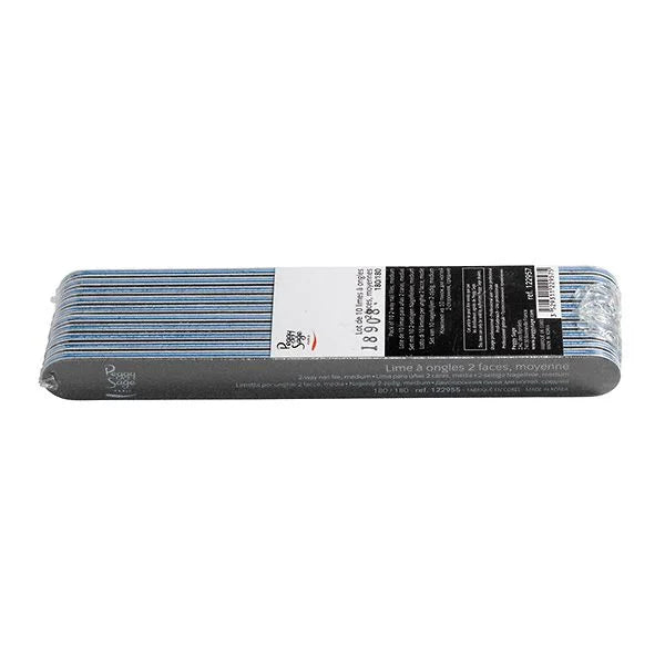 Scegli la qualità e la convenienza del lotto di 10 limette 2 facce bianche 180/180 Peggy Sage. Grazie alle 4 grane di dimensioni diverse, si adattano perfettamente a tutti i tipi di unghie, determinando il grado di abrasione dello smeriglio. Ideali per unghie naturali o finte.