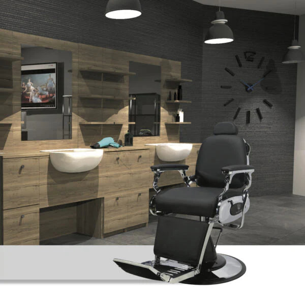 Il rivestimento nero elegante conferisce alla poltrona un aspetto sofisticato e intramontabile, perfetto per valorizzare qualsiasi ambiente del salone. Il design dalle linee pulite, impreziosito da dettagli cromati, dona un tocco di classe e professionalità, mentre l’imbottitura in schiuma ad alta densità assicura un comfort eccezionale anche durante i trattamenti più lunghi.