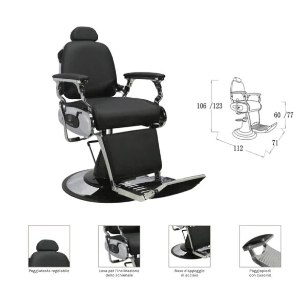 Dotata di uno schienale reclinabile regolabile in più posizioni e di un poggiatesta anch’esso regolabile, questa poltrona si adatta facilmente a ogni cliente, offrendo supporto ottimale a testa e collo. La pompa idraulica consente di regolare con precisione l’altezza, garantendo una postura ergonomica per il barbiere e facilitando ogni fase del lavoro. Completa il tutto una robusta base in acciaio cromato, che assicura stabilità, durata e resistenza all’usura quotidiana.