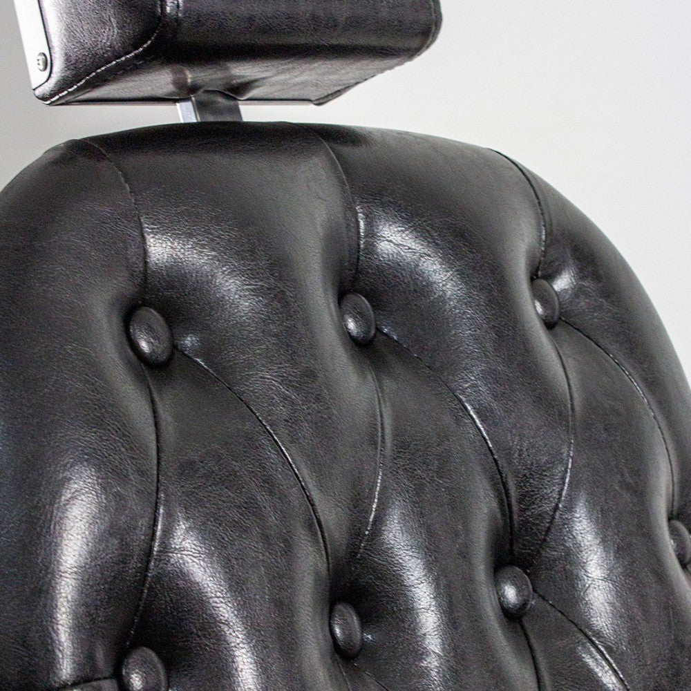 Il rivestimento in ecopelle nera trapuntata con bottoni regala un look elegante e offre una seduta morbida e accogliente, per garantire il massimo comfort ai tuoi clienti durante tagli e trattamenti.