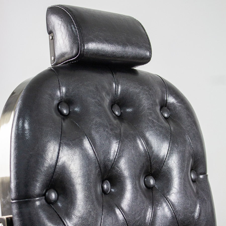Il rivestimento in ecopelle nera trapuntata con bottoni regala un look elegante e offre una seduta morbida e accogliente, per garantire il massimo comfort ai tuoi clienti durante tagli e trattamenti.