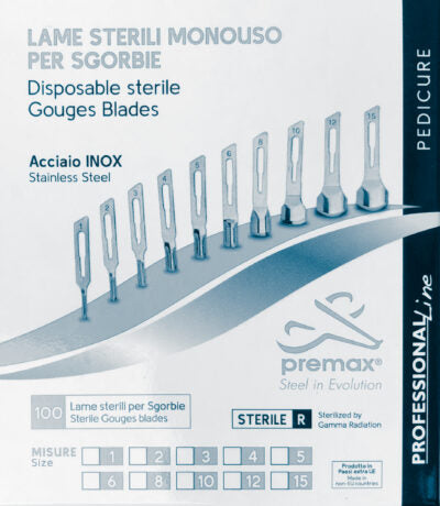 Le Premax lame Sgorbie sono realizzate in acciaio inossidabile e finitura sabbiata per garantire un taglio preciso di 15 mm. Oltre a essere antiallergiche e con basso contenuto di nichel, possono essere sterilizzate in autoclave per un utilizzo più sicuro e igienico. Prodotte in Italia, sono perfette per un lavoro professionale e di alta qualità.