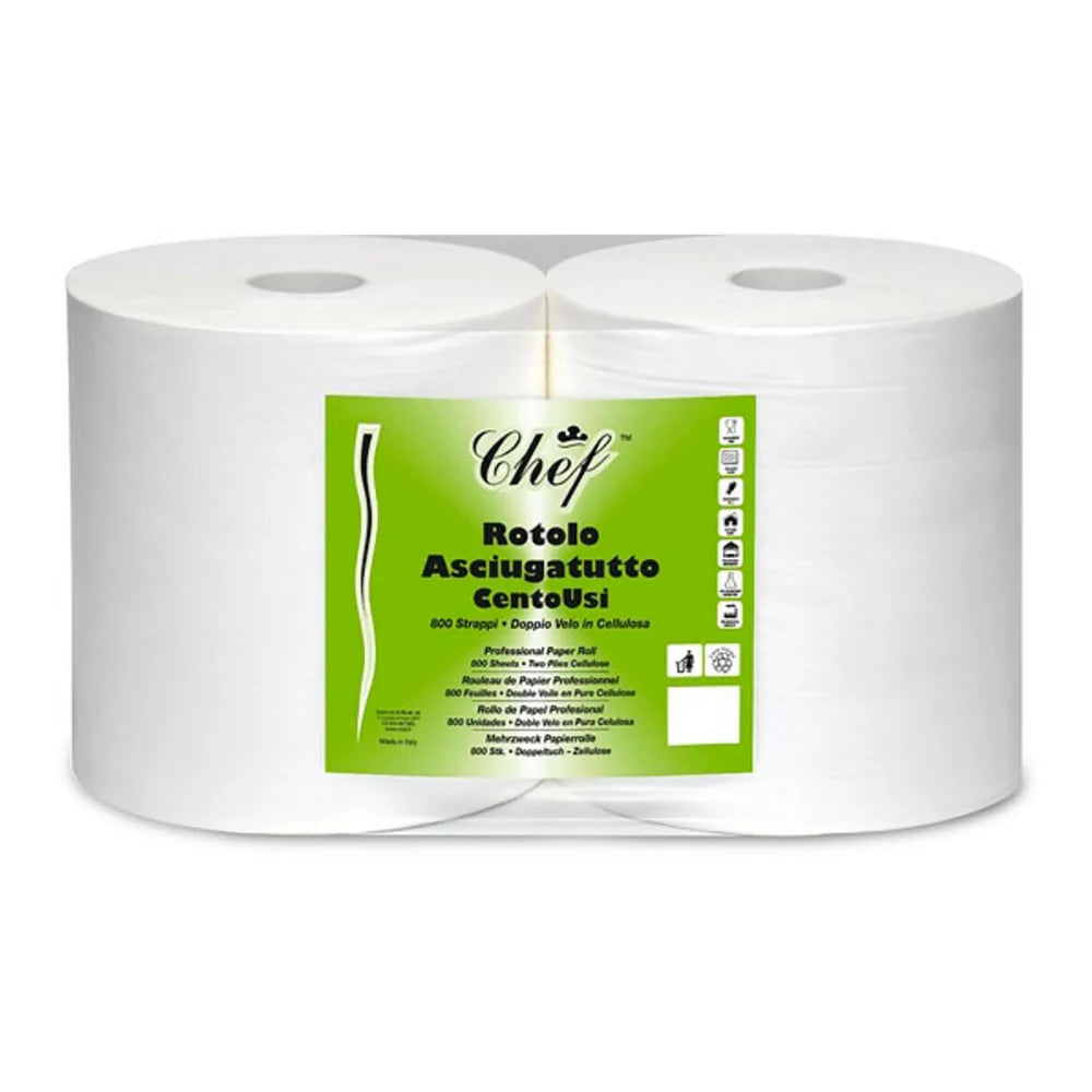 Rotoli asciugatuttoto di carta monouso 2 veli in pura cellulosa con lavorazione micro goffrata incollata.