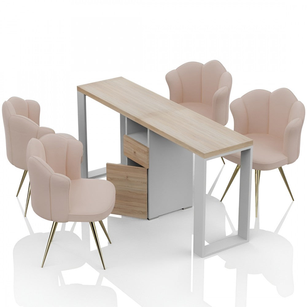 Progettato per ottimizzare il lavoro in salone, questo tavolo manicure a doppia postazione consente a due operatrici di lavorare contemporaneamente in perfetta sincronia, senza ostacoli o sovrapposizioni di spazio. Il piano di lavoro extra ampio assicura il massimo comfort anche per le clienti, che potranno godere di un trattamento comodo e privo di fastidi.